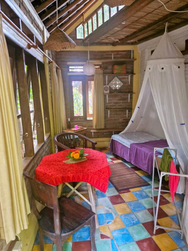 A cozy and spacious 1st floor, room with a large veranda, ocean- and garden view. Comfortable furnished with unique bamboo furniture and a double bamboo bed, 2 m x 1.80 m mattress.